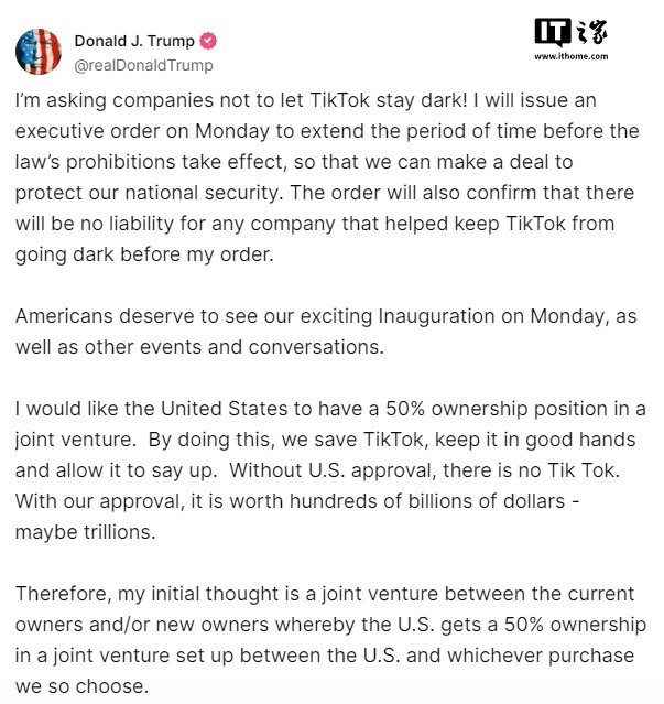 特朗普曾在酬酢媒体发文称,将于当地时辰周一(1 月 20 日)发布一项行政敕令,延伸 TikTok 禁令法定奏效前的时限。他还称J9体育网,在行政敕令下达前,任何协助 TikTok 幸免关停的公司齐无需承担背负。特朗普另外在示,为了“支持 TikTok”,他但愿好意思方“能在改日的联合企业中领有 50% 的悉数权”。