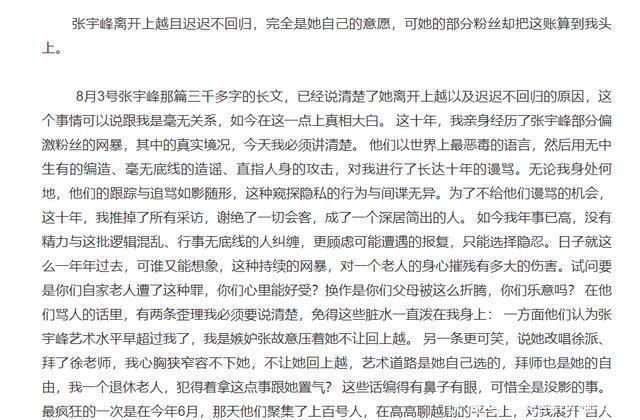这也就给一些驳诘者提供了“可乘之机”。一技艺,“师徒反目构怨”、“曹银娣打压张宇峰”、“曹银娣将张宇峰赶出上越”等传言络续于耳。 而一些爱重着张宇峰的狂热粉丝,在不解真相的情况下,被“节律”带偏,以“护崽子”的心态,泾渭不分,便通过网罗,向张宇峰的恩师曹银娣发起了狞恶的挫折。 尤其是张宇峰2015年离开上海越剧院后,这种挫折愈加变本加厉,导致曹银娣真挚碰到网暴长达十年之久。
