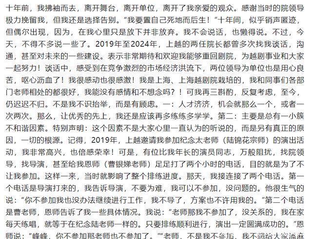 但没猜想,很快就碰到“滑铁卢”。 联系方面建议,惟有有张宇峰参与,那么《珍珠塔》的“版权就必须终断”。 这也就意味着,惟有有张宇峰,那么这出《珍珠塔》就无法再演下去。 这无疑又让张宇峰复出的但愿,再次虐待。 她心中的隐秘,我们也能体会一二。 是以,2025年8月3日,她通过自媒体平台,挥洒幽静写了一篇3000字的长文,证明了我方这多年来的碰到,也复原了一些大众所忖度的真相——比如她为何会离开上海越剧院的具体原因。