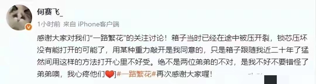 何赛飞坐窝露面在外交平台解释了起来,默示仅仅箱子跟了20多年倏得坏了,心里有些不好受,确定不是两位弟弟的错。
